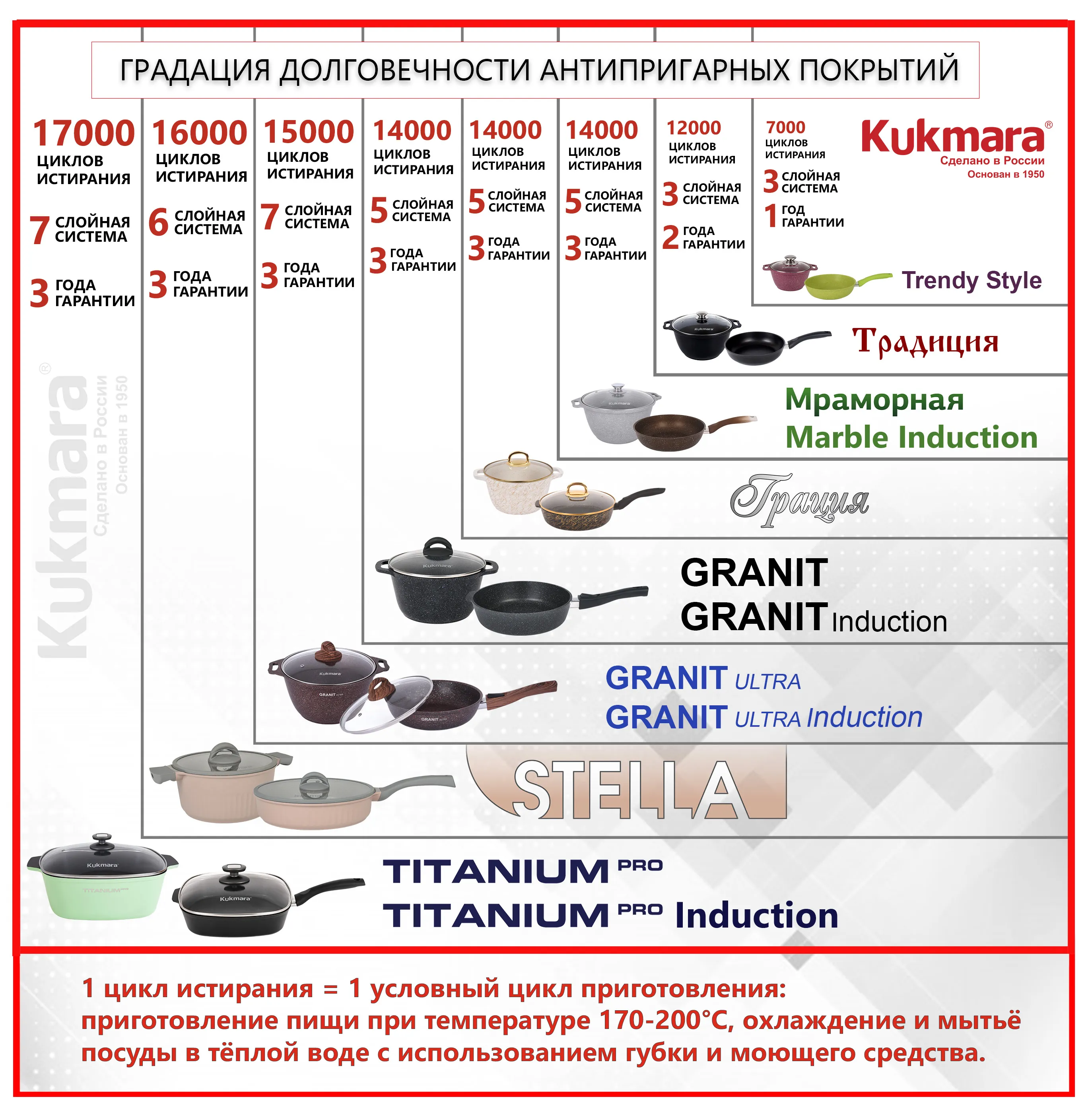 Коллекция “Granit Ultra” обладает ультрапрочной системой 7-слойного антипригарного покрытия европейского качества, усиленным сверхтвердыми минеральными частицами нового поколения, близкими по твердости алмазу. Такое покрытие гарантирует долгий срок службы даже при ежедневной эксплуатации с использованием неострых металлических кухонных принадлежностей. Покрытие выдерживает не менее 16 000-15 000 циклов истирания.