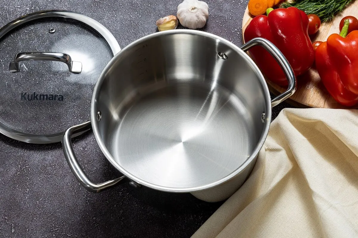 Посуда из нержавеющей стали бренда Kukmara имеет плоское, утолщенное дно, состоящее из 3-х слоев металла: индукционного, термоаккумулирующего и проводящего, которое распределяет тепло и не дает пище подгореть. 3-х слойное дно позволяет использовать посуду на любых видах плит, в том числе индукционных и стеклокерамических.